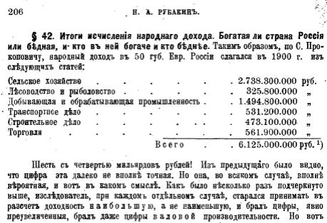 Н.А. Рубакин в работе 1912 года «Россия в цифрах. Страна. Народ. Сословия. Классы.» публикует данные о народном доходе начала века. В «Итогах исчисления народного дохода читаем: