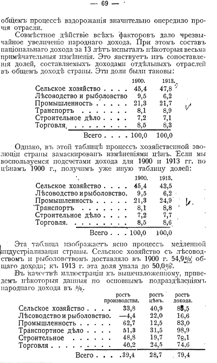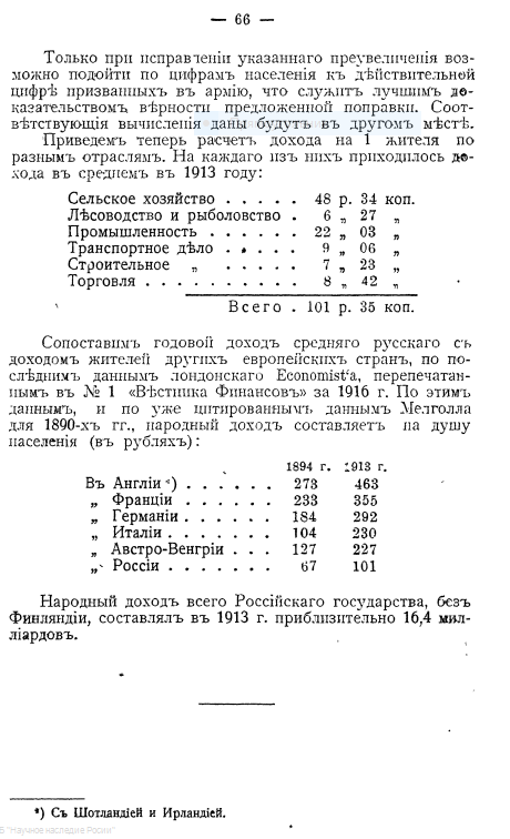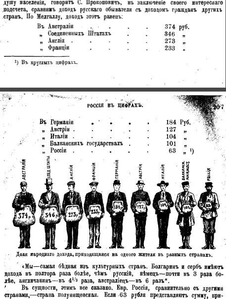 «Болгарин и серб имеют дохода в полтора раза более, чем русский, немец — почти в 3 раза более, англичанин — в 4½ раза, австралиец — в 6 раз”. В сущности, этим все сказано. Европейская Россия, сравнительно с другими странами, — страна полунищенская. … Если мы вспомним, сколь значительная часть народного дохода поступает ежегодно в пользу казны³*, сколько поглощается духовенством и другими общественными группами, не участвующими в производстве материальных ценностей, то не можем не придти к выводу, что на долю главнейших создателей народного дохода приходится еще меньшая доля его.»