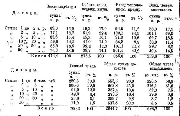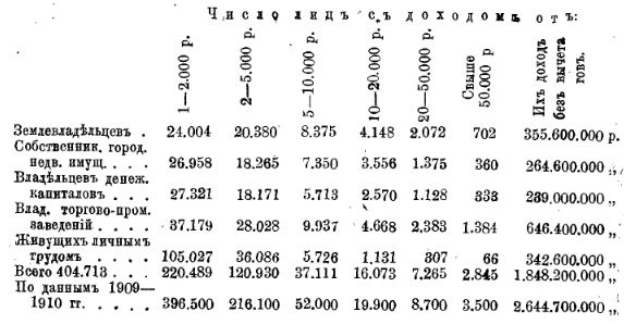 По 1905 году их доход (404.713 лиц, или 4,16% населения) составлял долю примерно в треть общего народного дохода. «В 1909 1910 гг.* было насчитано 696.700 человек с таким доходом которые распределялись по размерам своих доходов так: