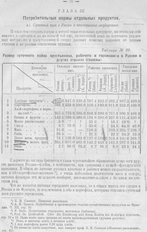 «С первого же взгляда бросается в глаза чрезвычайное обременение пищи всех кругов населения России – хлебом, в особенности, при сравнении с пищей – французского населения. В общем же питание русских крестьян можно охарактеризовать как хлебно-картофельно-молочное с очень небольшим количеством мяса и сахара; питание француза тех же классов наоборот, мясо-молочно-хлебное с большим количеством яиц. Что же касается питания городского населения, то в общих чертах оно сходно в России и во Франции, за исключением хлеба и картофеля, которыми отягощён суточный паёк русского горожанина.»
