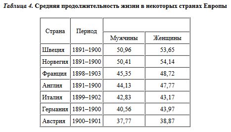 По этому показателю Россия заметно отставала от многих европейских стран, особенно от Скандинавии. Продолжительность жизни мужчин в России была на 21 год ниже, чем в Швеции и Норвегии, у женщин эта разница была еще выше - 22 года
