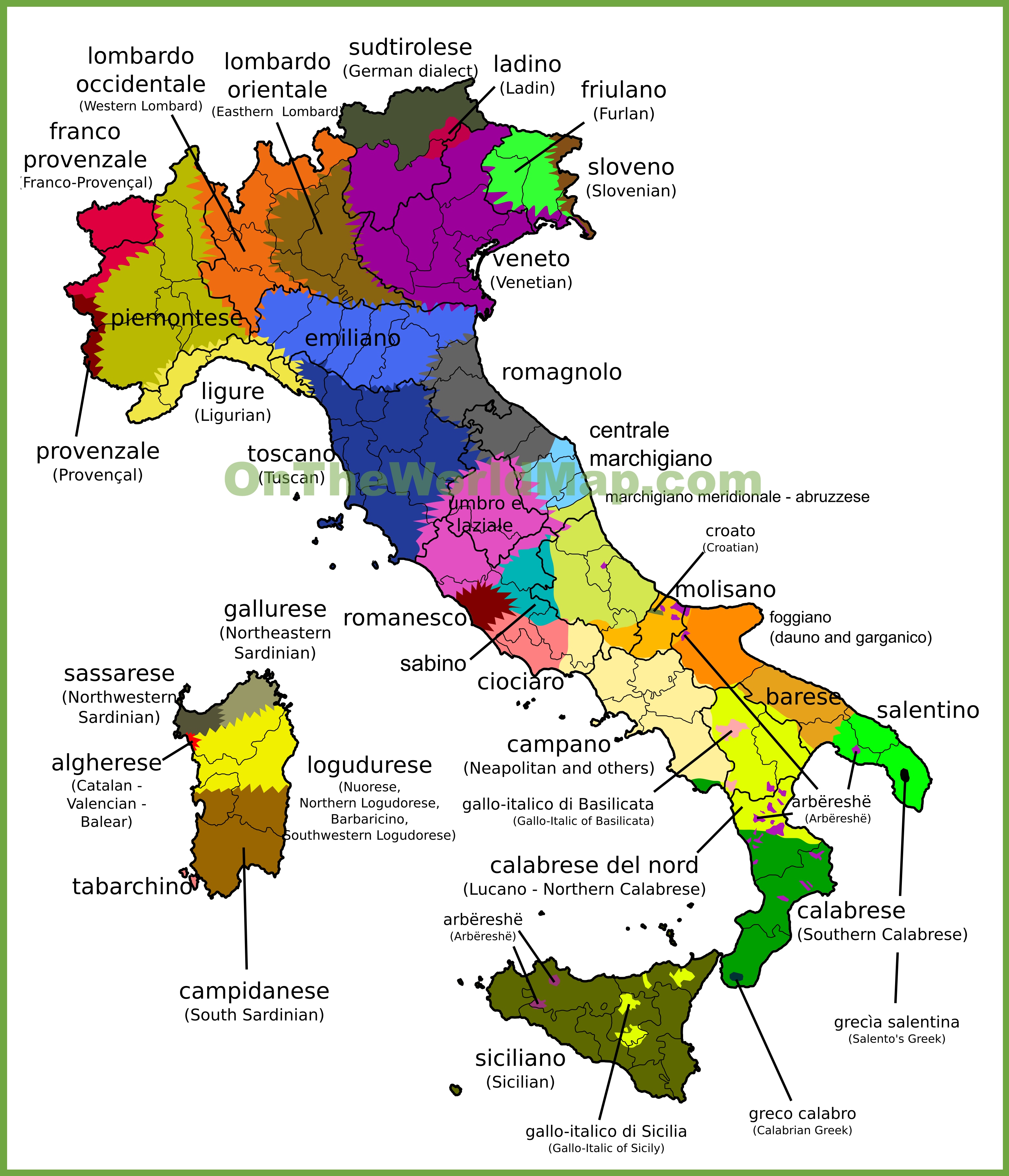 unrealcolonel: -- Вы, очевидно, не в курсе, что в Германии носители разных диалектов -- напр. верхненемецких и нижненемцких -- до сих пор друг друга не всегда понимают, и в Италии аналогично. Вот вам карта итальянских диалектов:
