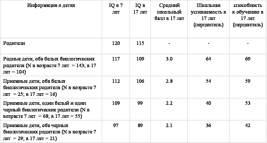 Из этих данных видно, что по мере того, как уменьшался эффект факторов совместной среды, IQ приемных детей (белых и черных) стремился к средним величинам для соответствующих популяций. И снова, разница в одно стандартное отклонение между приемными белыми и черными детьми осталась без изменений. Более того, в возрасте 17 лет исследователи использовали дополнительные индикаторы: среднюю школьную оценку, рэйтинг в классе, и рэйтинг по способности к обучению в школе. Эти показатели четко коррелировали с IQ оценками. Хотя эти данные могут быть частично объяснены культурной моделью, она не в состоянии объяснить IQ приемных детей восточно-азиатского происхождения, значительно превышающий IQ их белых приемных сверстников и иногда даже приемных родителей (см. выше; дело в том, что если IQ определяется исключительно культурными влияниями, то можно найти объяснения неуспешности черных и цветных детей в белых семьях, но не преуспевания детей восточно-азиатского происхождения).
