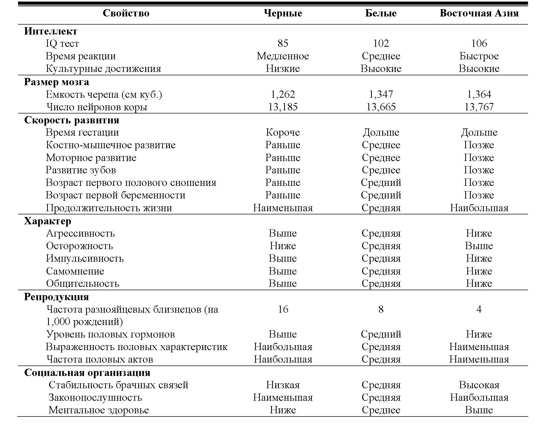 8. В заключение, исследователи проанализировали набор из 60 всевозможных психологических, культурных, биологических и социальных жизненных переменных и продемонстрировали существование расового континуума с неграми на одном конце, представителями северо-восточных азиатских народов на другом, и с белыми европейского происхождения посередине, Эта матрица позволила сделать ряд новых предсказаний, вытекающих из некоторых современных теорий эволюции человека, которые были протестированы и подтверждены (Rushton, J. P. (2000). Race, evolution, and behavior: A life history perspective).