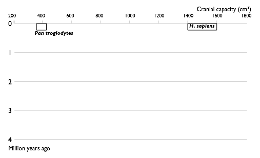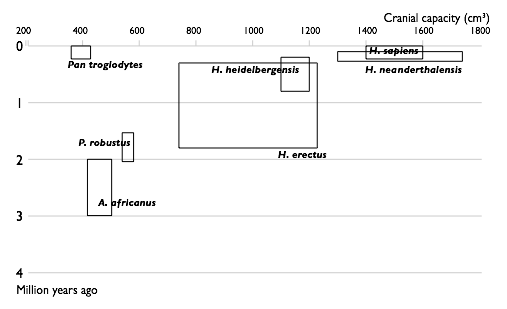 Итак, в ходе эволюции у гоминид сначала развилось прямохождение, и только много позже началось существенное увеличение объема мозга. У австралопитеков, живших 4—2 миллиона лет назад, объем мозга был около 400 см³, примерно как у шимпанзе. Человек умелый (Homo habilis) жил 2.4—1.4 миллионов лет назад (кости известны начиная с 2 млн лет, более древние находки представлены только каменными орудиями), размер мозга у него был 500—640 см³. Человек работающий (Homo ergaster) жил 1.9-1.4 миллионов лет назад, размер мозга — 700—850 см³. Человек прямоходящий (Homo erectus) жил 1.4-0.2 миллионов лет назад, размер мозга составлял от 850 см³ у ранних особей до 1100 см³ у поздних. Гейдельбергский человек (Homo heidelbergensis) жил 600—350 тысяч лет назад, размер мозга составлял 1100—1400 см³. Неандертальцы (Homo neanderthalensis) жили 350-30 тысяч лет назад, размер мозга составлял 1200—1900 см³. 200 тысяч лет назад появился человек разумный (Homo sapiens), размер мозга 1000—1850 см³. Перечисленные виды хорошо представлены в палеонтологической летописи. См. описания ископаемых гоминид и большую подборку литературы по теме в обзоре "Происхождение человека"
