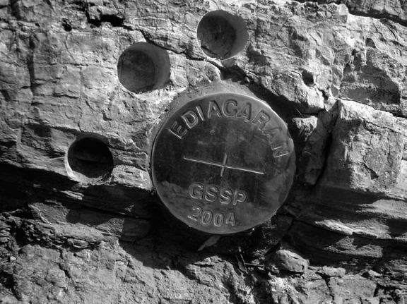 "Золотой гвоздь", вбитый в границу отложений криогенового и эдиакарского (вендского) периодов в типовом разрезе в Австралии. Возраст этой границы - около 635 млн лет. Ниже этой границы, в криогеновых отложениях, по всему миру присутствуют недвусмысленные следы величайшего в истории Земли оледенения (ледники доходили до экватора, Земля в том время едва не превратилась в "снежок", см. Snowball Earth). В криогеновых отложениях обнаружены химические следы присутствия низших многоклеточных животных - губок (см.: Животные появились свыше 635 миллионов лет назад), более сложные животные не найдены. Выше этой границы, в эдиакарском периоде, появляются ископаемые эмбрионы многоклеточных, заключенные в сложные оболочки, и другие формы животной жизни (см.: Тайна эмбрионов Доушаньтуо раскрыта; Малаховская, Иванцов. Вендские жители земли). Дырки, высверленные около "золотого гвоздя", остались после взятия проб для палеомагнитного анализа (этот метод позволяет определить, на какой географической широте находился данный район в то время, когда образовывались эти слои).