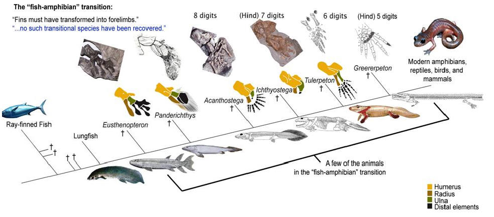По сути дела, основное, что изменилось при переходе от рыб к тетраподам - это строение конечностей. Но конечности (плавники) девонских лопастеперых рыб не так уж сильно отличались по своему строению от лап примитивных тетрапод. А главное, можно в деталях проследить изменения конечностей в эволюционном ряду, соединяющем рыб и тетрапод. На сегодняшний день этот филогенетический ряд включает около дюжины последовательных переходных форм, из которых можно упомянуть наиболее важные (в порядке убывания рыбьих и накопления тетраподных черт строения): Eusthenopteron, Panderichthys, Tiktaalik, Elpistostege, Livoniana, Elginerpeton, Ventastega, Metaxygnathus, Acanthostega, Ichthyostega, Tulerpeton (жирным шрифтом выделены роды, у которых известно строение конечностей; у остальных конечности сохранились плохо или вовсе пока не найдены). Первый род в этом списке - еще "типичная рыба", последний - бесспорная амфибия. Посередине помещаются все промежуточные этапы этого "макроэволюционного" преобразования.
