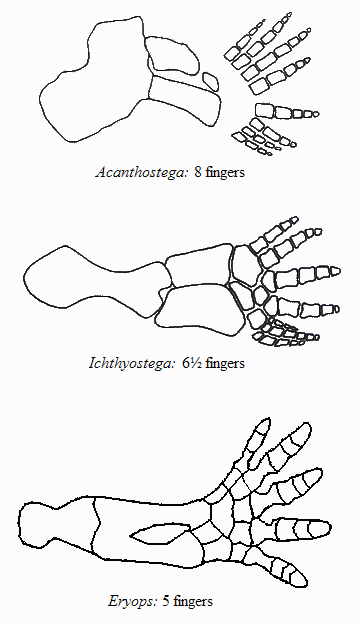 Конечности древнейших животных, которых безоговорочно относят уже к тетраподам, то есть к первым амфибиям (акатностега, ихтиостега), представляют собой всего лишь еще один небольшой шажок в сторону дифференциации дистальных частей скелета, т.е. кисти. У акантостеги еще сохранялись внутренние жабры, у ихтиостеги они уже редуцировались (наружные жабры у личинок амфибий сохраняются и сегодня). В дальнейшем у древнейших амфибий происходило постепенное развитие шейного отдела. Совершенно непонятно, где в этом ряду находится искомый великий "макропереход". Сказать, что переход от эустеноптерона к пандерихту и от пандерихта к тиктаалику - это "микро", а вот от тиктаалика к акантостеге - это уже "макро", может только очень предвзятый человек. И, конечно, среди специалистов-палеонтологов нет никого, кому пришло бы в голову это утверждать.