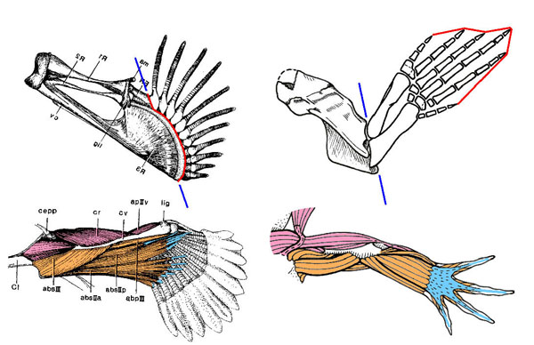 Схема строения передних конечностей мелководного удильщика span lang="en-us">Antennarius и древней амфибии Tulerpeton. Гомологичные группы мышц показаны одинаковыми цветами. Синей линией показано "главное место сгиба": у тулерпетона это локтевой сустав, а у удильщика - нечто совсем другое, но аналогичное по функции. Изображение предоставил А.Н.Кузнецов.