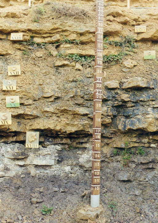 Фрагмент стратотипа (эталонного, или типового геологического разреза) отложений тоарского века (это последний век ранней юры, начавшийся 183 млн лет назад и закончившийся 175,6 млн лет назад; его можно найти на приведенной выше международной шкале - Toarcian). Стратотип находится во Франции, но отложения тоарского века известны по всему миру. Решения о том, какой разрез считать типовым, принимает Международная стратиграфическая комиссия. Быстрая эволюция аммонитов в тоарском веке (их изображения можно видеть на пронумерованных табличках) позволяет подразделить тоарские отложения на множество последовательных "зон" - геохронологических интервалов гораздо меньшей длительности чем "век" (геологические века длились по несколько миллионов лет). Никакая "сортировка" ископаемых во время Потопа - ни гидродинамическая, ни экологическая - не могла бы обеспечить присутствие каждого из руководящих видов аммонитов (морских активно плавающих животных) только в одном узком слое осадков, прослеживающихся на большой территории. Особенно если учесть, что эти виды были очень сходны и по размеру, и по экологии, и по строению, так что различить их может только специалист. Эти виды, несомненно, сменяли друг друга в геологическом времени, а осадки накапливались в течение весьма длительного срока.
