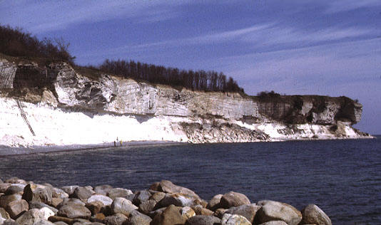 Отложения датского века (Danian), первого века кайнозойской эры, - в данном случае это темный известняк - залегают поверх ярко-белых меловых отложений маастрихтского века (Maastrichtian), последнего века мезозойской эры. Граница белых и темных слоев соответствует рубежу мезозоя и кайнозоя (65,5 млн лет), когда вымерли последние динозавры, аммониты и многие другие животные. Ископаемые фауны белого и темного слоев различаются очень сильно (потому что на этом рубеже произошло массовое вымирание), и так по всему миру (этот снимок сделан в Дании).