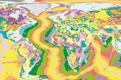 Геологическая карта мира (источник: OneGeology). На геологических картах разными цветами обозначается возраст отложений, залегающих на поверхности (точнее, непосредственно под слоем четвертичных, то есть самых молодых отложений). На этой карте используются такие же цвета, как на глобальной геохронологической шкале, приведенной выше. Обратите внимание на то, как выглядит на геологической карте Атлантический океан (для океанского дна показан возраст базальтового основания, без учета накопившихся сверху более молодых осадочных пород). Возраст океанского дна наглядно свидетельствует об истории океана. Новое океанское дно формируется в районе Центрально-Атлантического хребта и "расползается" на запад и восток. Чем дальше от хребта, тем древнее породы. Самые старые участки дна океана, у берегов Африки и Америки, окрашены зеленым, кое-где голубым цветом, что соответствует меловому и юрскому возрасту. Именно тогда и начал образовываться Атлантический океан (см.: тектоника). Америка и Старый Свет расползаются в разные стороны примерно с такой же скоростью, с какой у человека растут ногти. Самое замечательное, что сегодня мы уже можем непосредственно наблюдать это движение и измерять его скорость (при помощи высокочувствительной аппаратуры, установленной на спутниках). Антиэволюционисты, верящие в молодой возраст Земли и не верящие в точность радиометрического датирования, все равно не в состоянии объяснить, почему результаты этого датирования оказались именно такими.