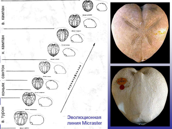 Последовательная смена восьми видов неправильных морских ежей рода Micraster в отложениях верхнего турона - верхнего кампана (ок. 90 - 70 млн лет назад). Это пример последовательности небольших изменений, от которых антиэволюционисты обычно отмахиваются со словами "ну и что, еж остался ежом". Конечно, остался, ведь новые классы животных возникают крайне редко (морские ежи - это таксон ранга класса). Но здесь, тем не менее, мы видим последовательную смену восьми разных видов. Некоторые изменения морфологии в этом ряду выглядят ненаправленными, другие - вполне направленными (например, наблюдается неуклонное смещение рта все ближе к переднему краю панциря). Данный эволюционный ряд был связан с приспособлением микрастеров к жизни во все более тонкозернистом грунте (это зарывающиеся животные, питающиеся грунтом). Микрастеры вымерли 65,5 млн лет назад вместе с динозаврами, а вскоре после этого вымерли и другие роды этого семейства (Micrasteridae). Отряд, к которому относится это семейство (Spatangoida), дожил до наших дней, но он сегодня представлен уже другими семействами.