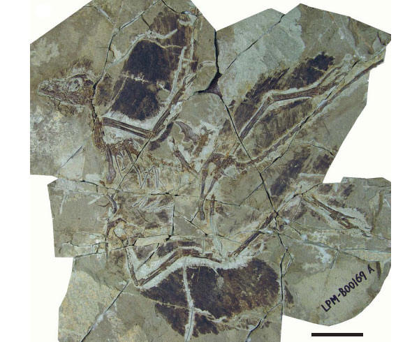 Anchiornis huxleyi. Видны отпечатки крупных контурных перьев, располагавшихся на всех четырех конечностях и на хвосте. Длина масштабной линейки — 5 см.