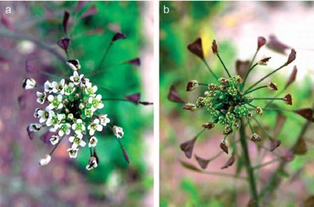 Соцветия пастушьей сумки с цветками дикого типа (а) и с цветками