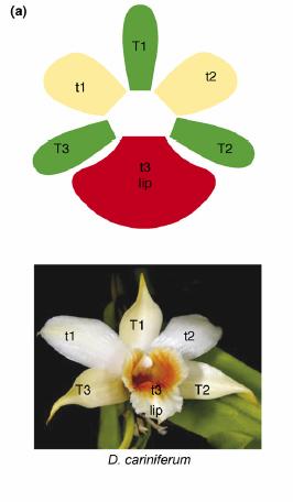 У орихидных,  однако, дело обстоит гораздо интереснее. Как обнаружила М. Мондрагон-Паломино и её коллеги, у них есть целых четыре DEF-подобных гена, и каждый из них выполняет свою функцию. Условно говоря, гены 1 и 2 определяют, что органы, формирующиеся под их контролем, станут именно листочками околоцветника, а не листьями, тычинками или плодолистиками; ген 3 задаёт отличия элементов внутреннего круга околоцветника от наружного, а ген 4 отвечает за образование губы и ее отличия от боковых листочков. Столь сложная система регуляции и обеспечивает разнообразие морфогенетических возможностей для цветков орхидных. Мы видим, в частности, что за  формирование губы у орхидей отвечает спецальный ген: не случайно некоторые морфологи трактовали эту часть околоцветника как совершенно особый орган.