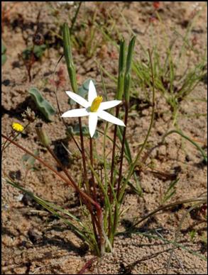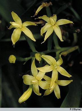 Слева: радиально-симметричный цветок у Spiloxene serrata, представителя семейства гипоксиевые (Hypoxidaceae) из Южной Африки. Справа: симметрия цветка орхидей Apostasia wallichii (подсемейство Apostasioideae) из Новой Гвинеи близка к радиальной.