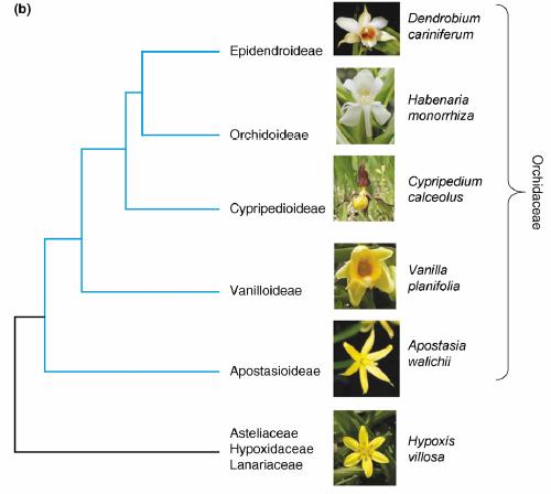 Родственные связи между Hypoxidaceae и подсемействами орхидных (из статьи Mondragón-Palomino & Theißen, 2008). Филогенетическое дерево, построено путем анализа последовательностей ДНК нескольких пластидных генов (rbcL, matK, atpB), взятых у большого числа видов из всех перечисленных семейств и подсемейств. Хотя эти гены не имеют отношения к развитию цветка, полученная на их основе схема родственных связей хорошо согласуется с имеющимися представлениями об эволюции этого органа у орхидных, в частности – с тенденцией к переходу от радиальной к двусторонней симметрии околоцветника.