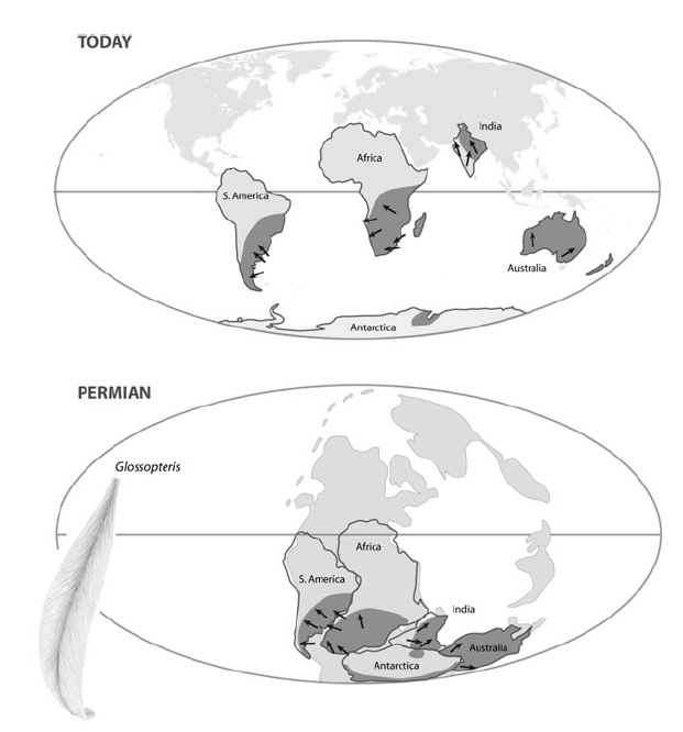 Положение континетов сегодня (верхний рисунок) и в пермском периоде (299-251 млн лет назад). Серым цветом выделены области распространения ископаемого семенного папоротника Glossopteris. В пермском периоде это растение было распространено в зоне с прохладным климатом вокруг южного полюса. На эту область периодически наползали с юга ледники, оставившие характерные следы в геологической летописи, по которым можно определить направление их движения (стрелки). И распространение Glossopteris, и направление движения ледников выглядят совершенно естественно и осмысленно на палеогеографической реконструкции, но не на современной карте мира Из Coyne, 2009.