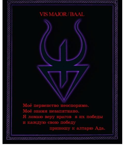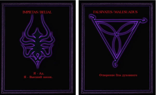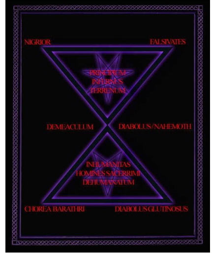 Нисходящий треугольник САТАН... он начинается с края левого плеча, потом правое, середина живота, и замыкается на том же левом плече. В его центре — Чёрное Солнце, оно же сердце. Сердце пылает пламенем, его свет чёрный, и у него три языка, которые поднимаются вверх. В его душе — Бездна и вечно крутящееся колесо поиска Истины. Поиск Истины цепляется за всё, что может охватить сознание. Это вечное колесо вращается, цепляя и разрывая острыми крюками жажды познания всё, на чем останавливается внимание. Оно ищет смысл вещей и находит его в них, осознав необходимость разрушения и создания вновь по идеалу внутреннего понимания их сути. И таким образом пытается восстановить гармонию, которой нет в Божественном мире, но которая есть только внутри Бездны души, озарённой светом Чёрного Пламени.