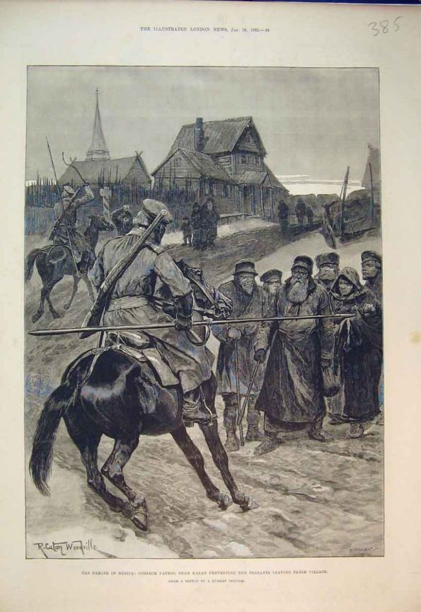 Казаки не дают крестьянам покинуть деревню чтобы пойти с сумой.
