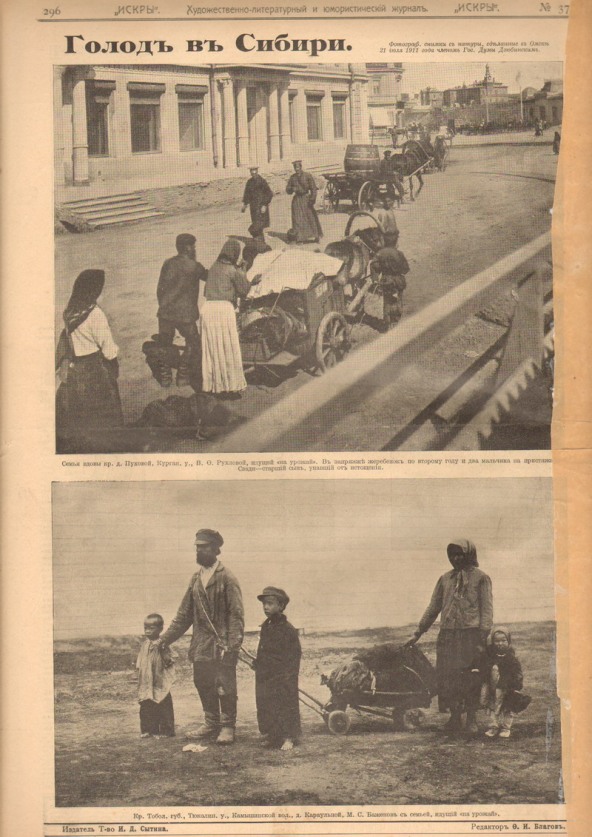 Вторая фотография: Кр. Тобол. губ., Тюкалин. у., Камышинской вол., д. Караульной, М. С. Баженов с семьей, идущий «на урожай». Источник: ЖУРНАЛ «ИСКРЫ», ГОД ОДИННАДЦАТЫЙ, при газете «Русское Слово». № 37, Воскресенье, 25 сентября 1911г. [http://www.odin-fakt.ru/iskry/_37_jurnala_iskry_god1911/]