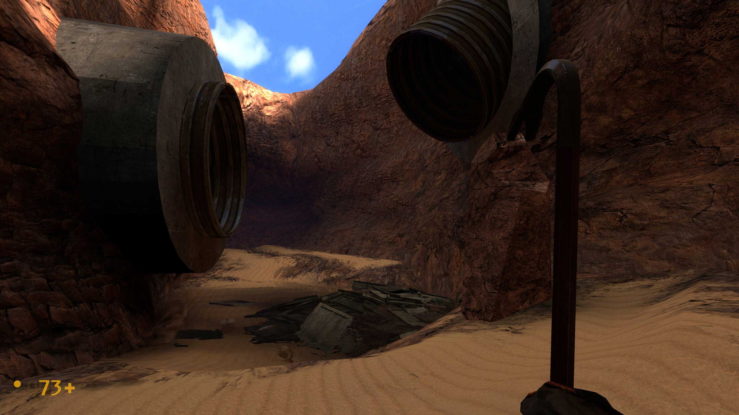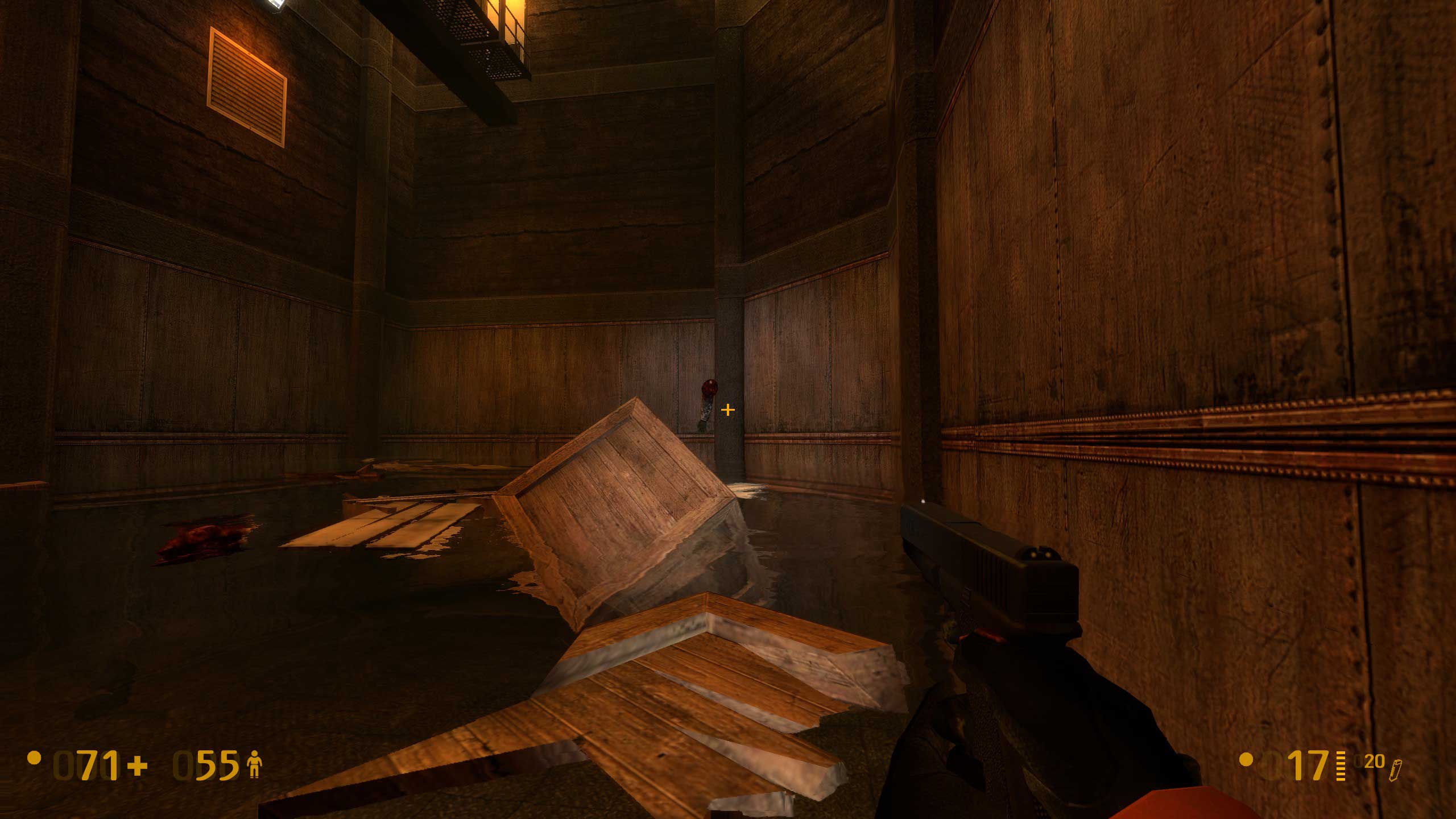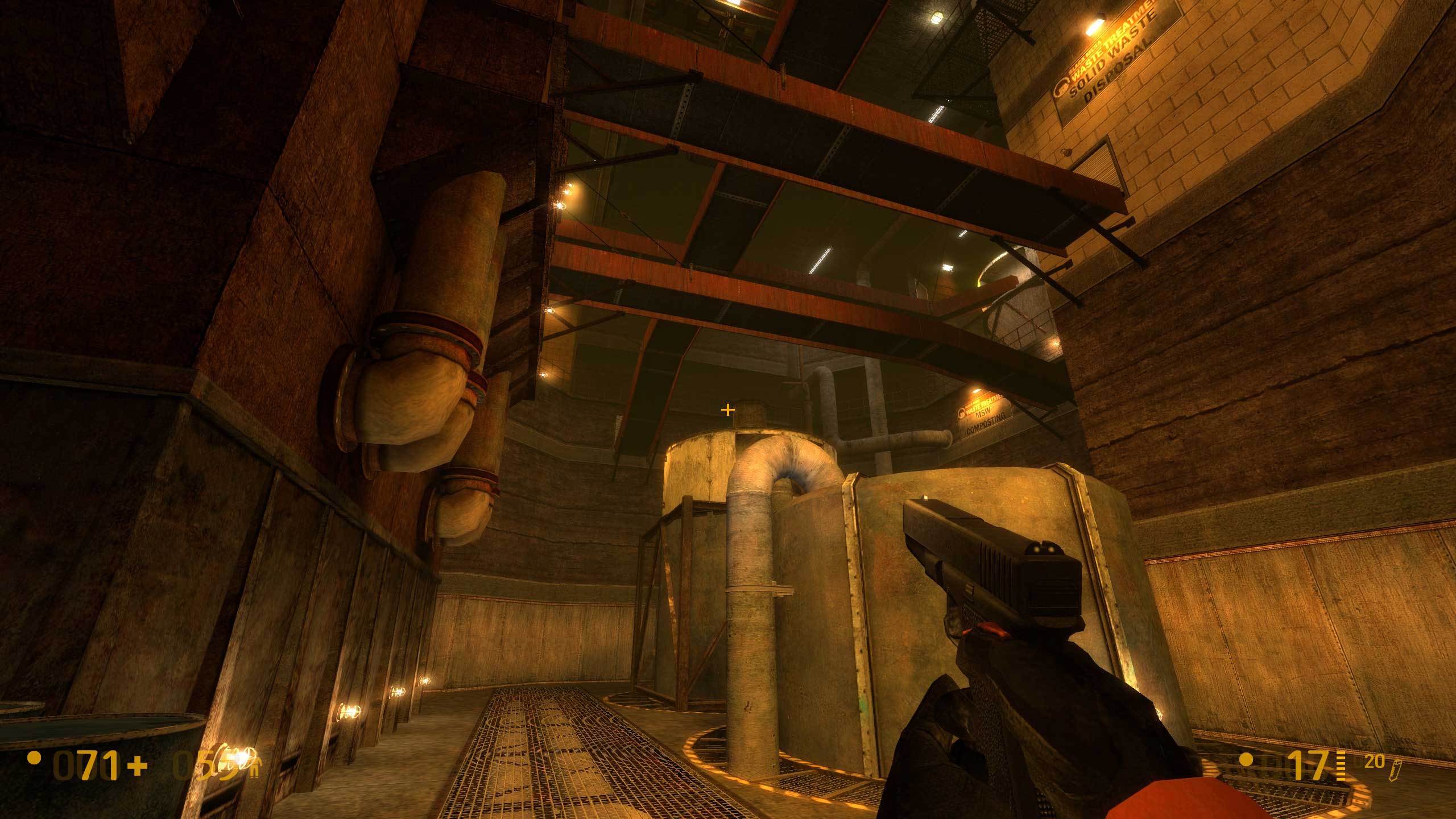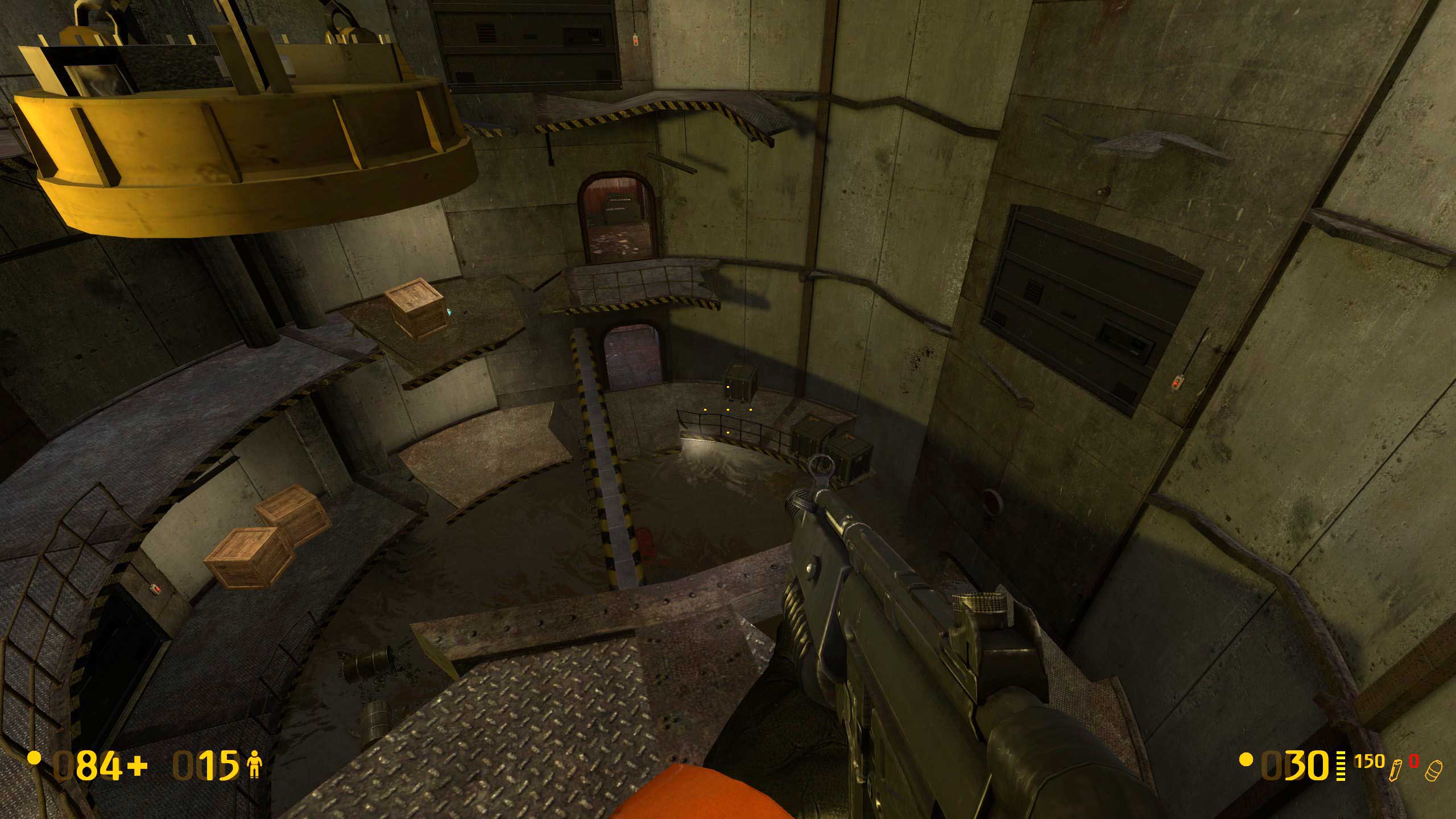 А вот тут начались сложности. Не знаю, как было в оригинальной версии Халфы, но тут видите внизу балку? Чтобы пройти дальше, надо на неё спрыгнуть. Сложного -- ровно ничего, но если промахнуться, то падаешь в воду. И вообще интересно, чего там, под водой, полезного. Но выхода я там не нашёл -- небольшой затопленный лабиринтик, но замкнутый. Лестница в колодце обваливается, и всё.