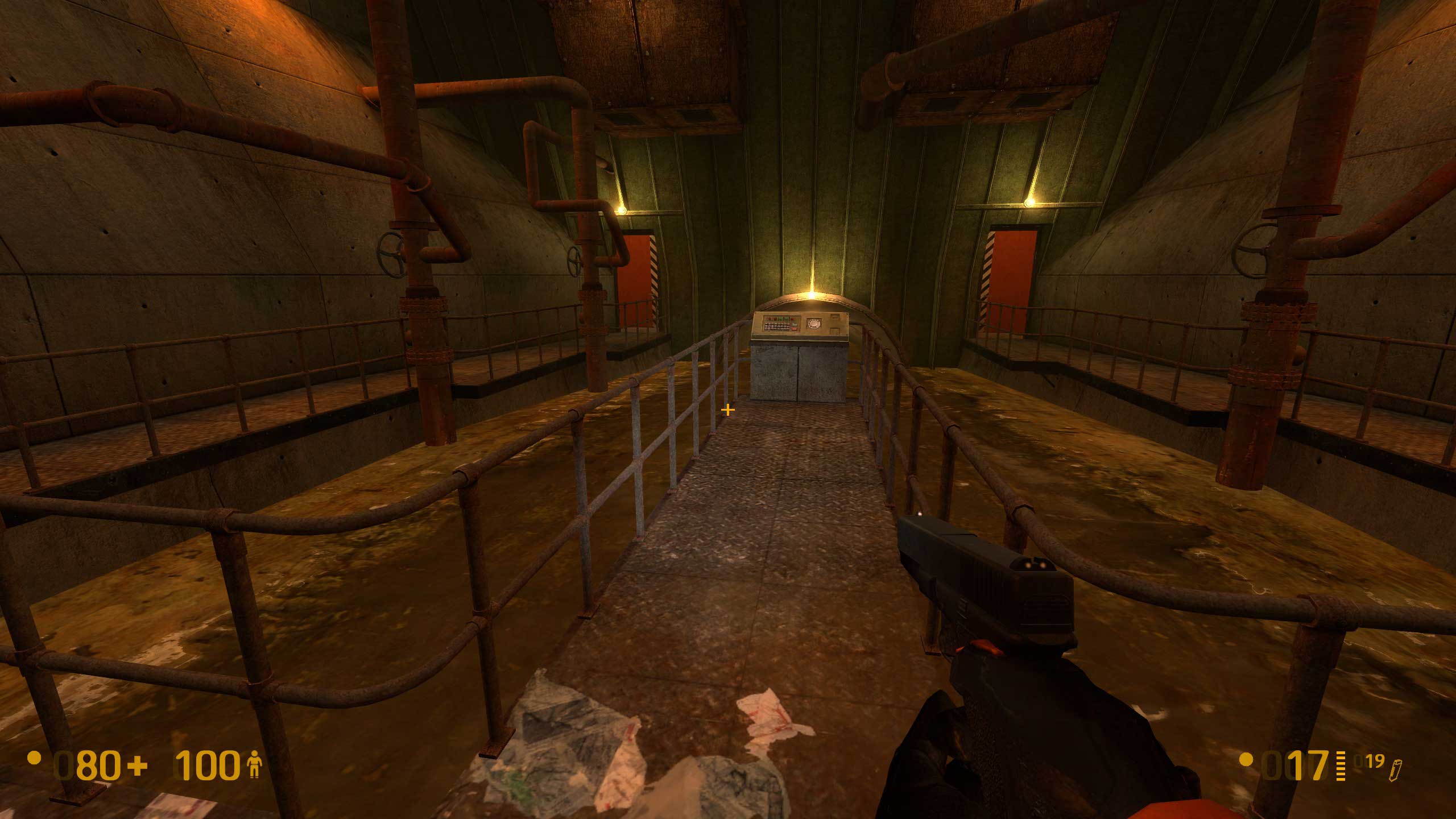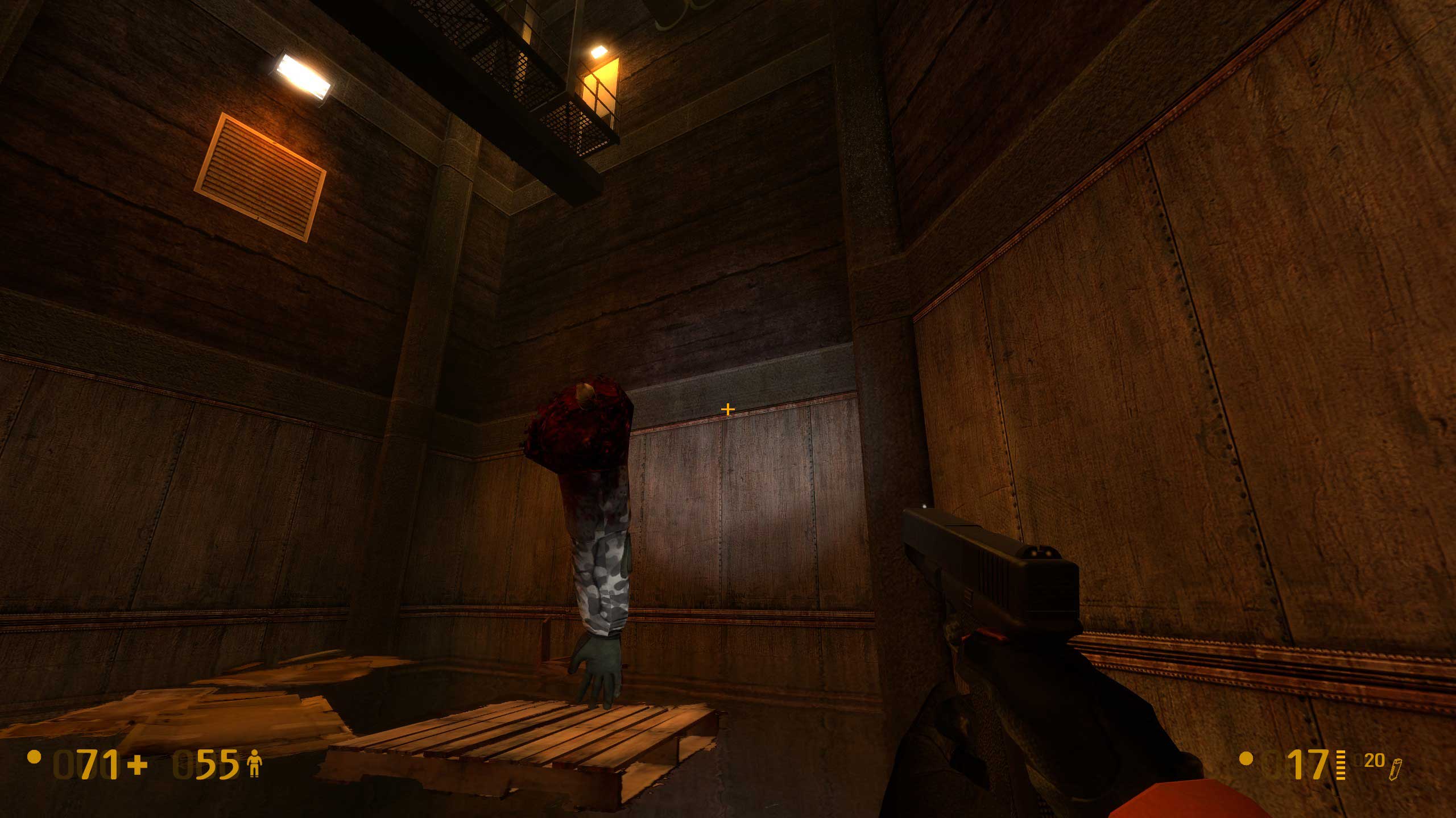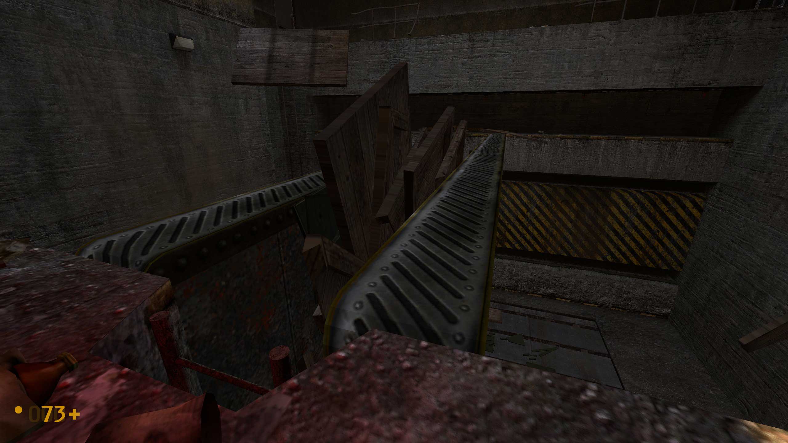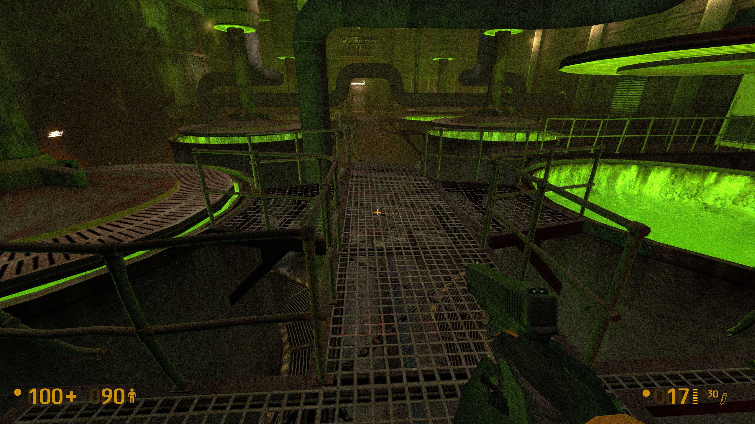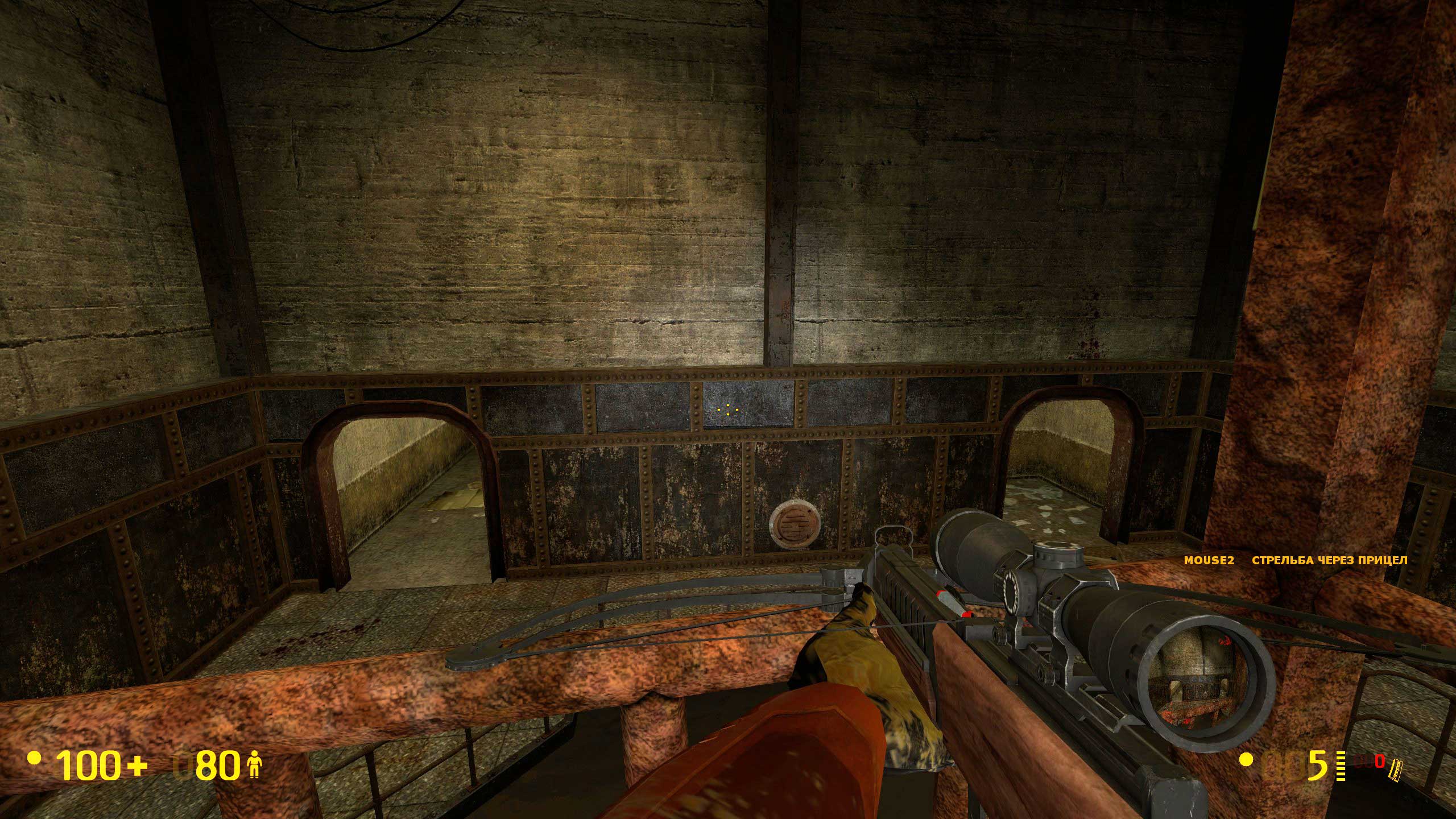 А вот тут начались сложности. Не знаю, как было в оригинальной версии Халфы, но тут видите внизу балку? Чтобы пройти дальше, надо на неё спрыгнуть. Сложного -- ровно ничего, но если промахнуться, то падаешь в воду. И вообще интересно, чего там, под водой, полезного. Но выхода я там не нашёл -- небольшой затопленный лабиринтик, но замкнутый. Лестница в колодце обваливается, и всё.