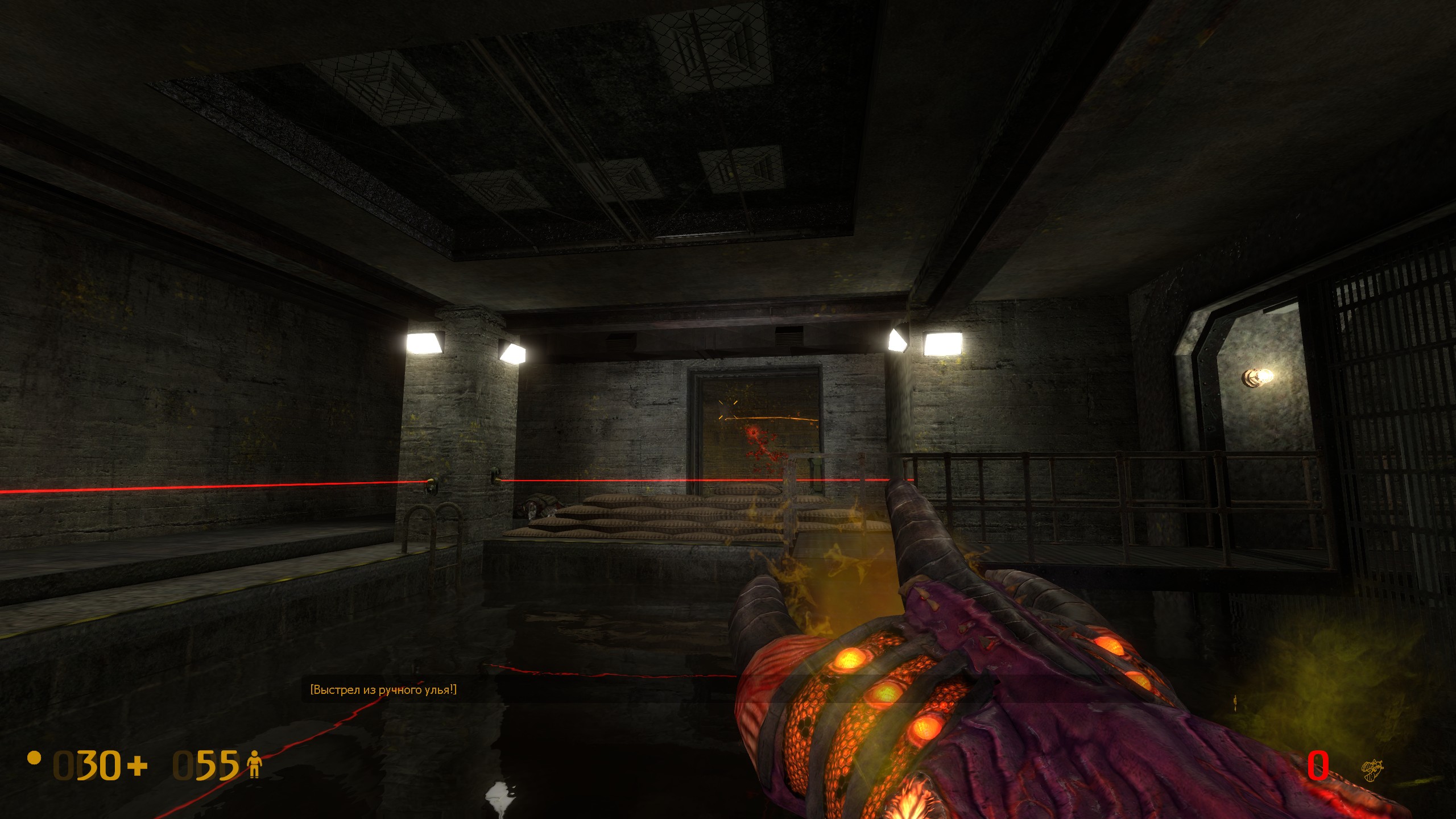 4. Иллюстрация достоинств ручного улья. Если плюхнуться в воду и вылезти, заденется сторожевой луч, сработают турели и выбежит два солдата. А если отсюда не смеша пострелять в дверь, то солдаты помрут (а у меня даже турели опрокинулись заодно). AI солдат тупит, когда в них ульем стреляют: надо атаковать стреляющего, а они бестолково отмухиваются -- и помирают.