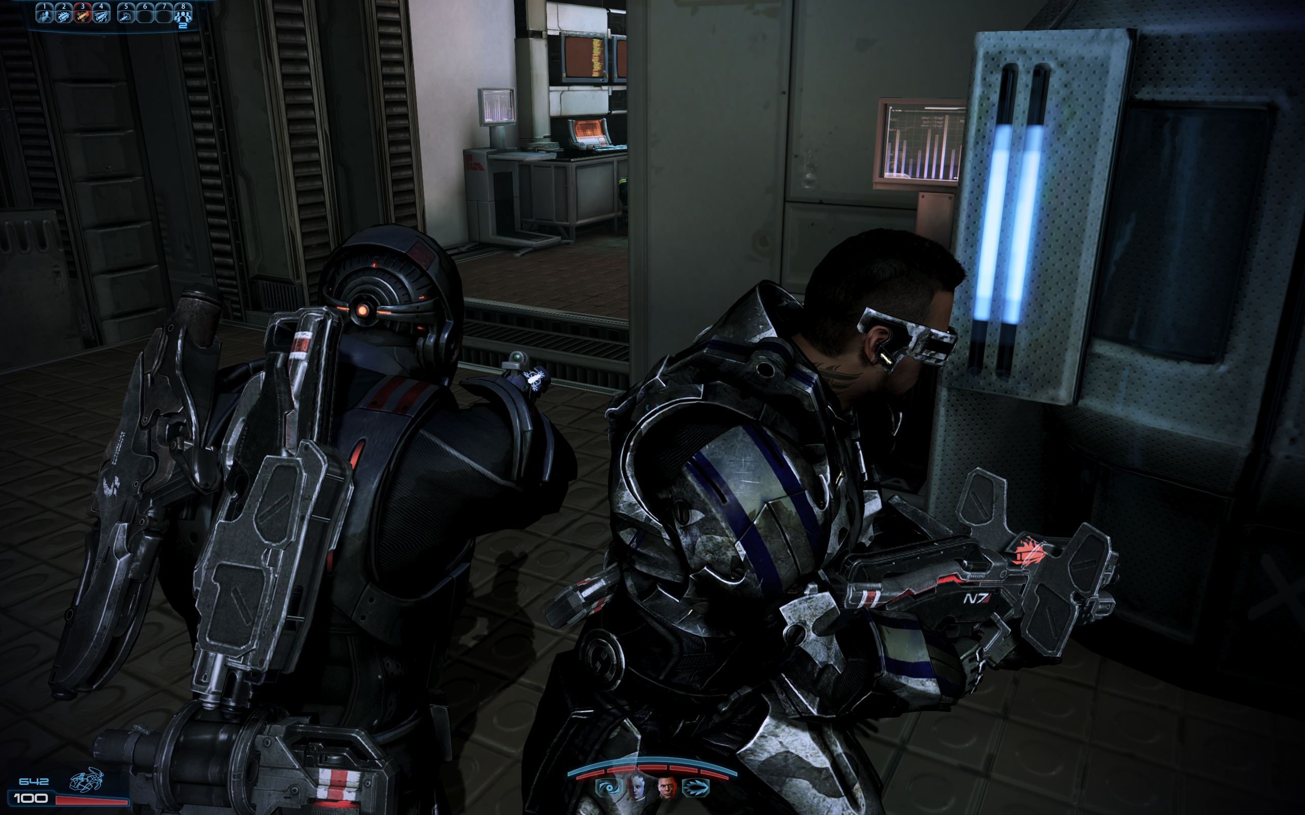 2. Новый Шепард. Решил перепройти солдатом (первый раз проходил разведчиком). Ну, что сказать? Без новых оружий было бы не сладко. Разведчик имел уникальное умение -- маскировку. Во-1, можно было спокойно стрелять из снайперки; во-2 -- когда что-то типа Твари подбегало в упор, можно было спокойно стать невидимым и удрать. Ещё был очень хороший навык "диверсия" -- перепрограммируешь турель издали, и она во врагов стреляет. И синтетиков аналогично.