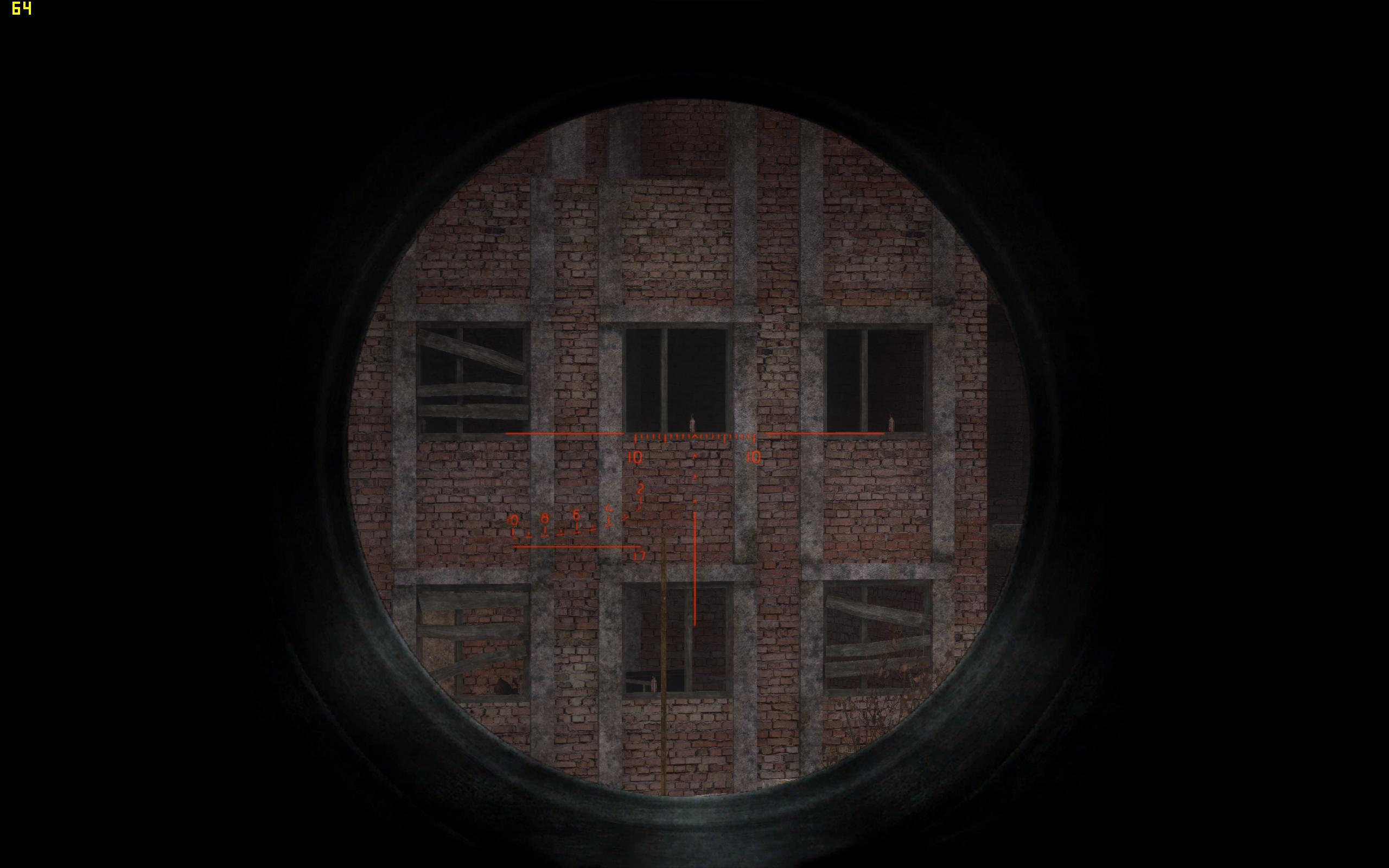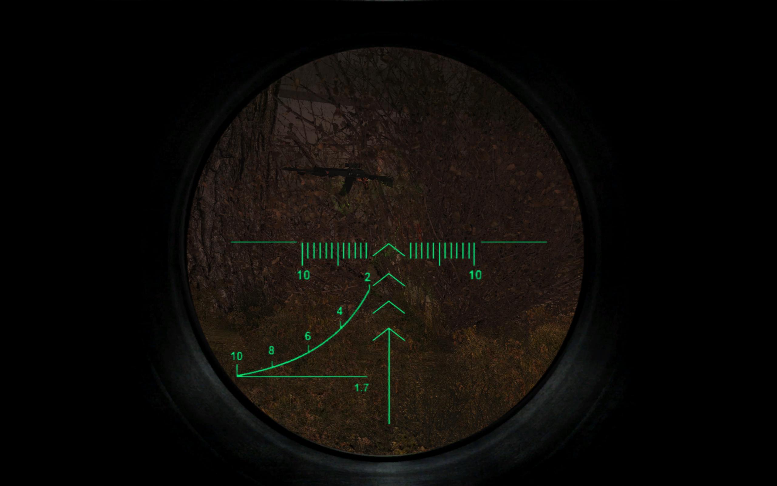 33. В Тёмной долине задание от Борова -- перестрелять 130 бутылок из 135. вот так их из СВД видно. Оставлю на потом это задание, когда прицел будет большей кратности. Попадать-то можно, а вот искать бутылки где-то на горизонте неохота, тут-то самые простые на скрине.