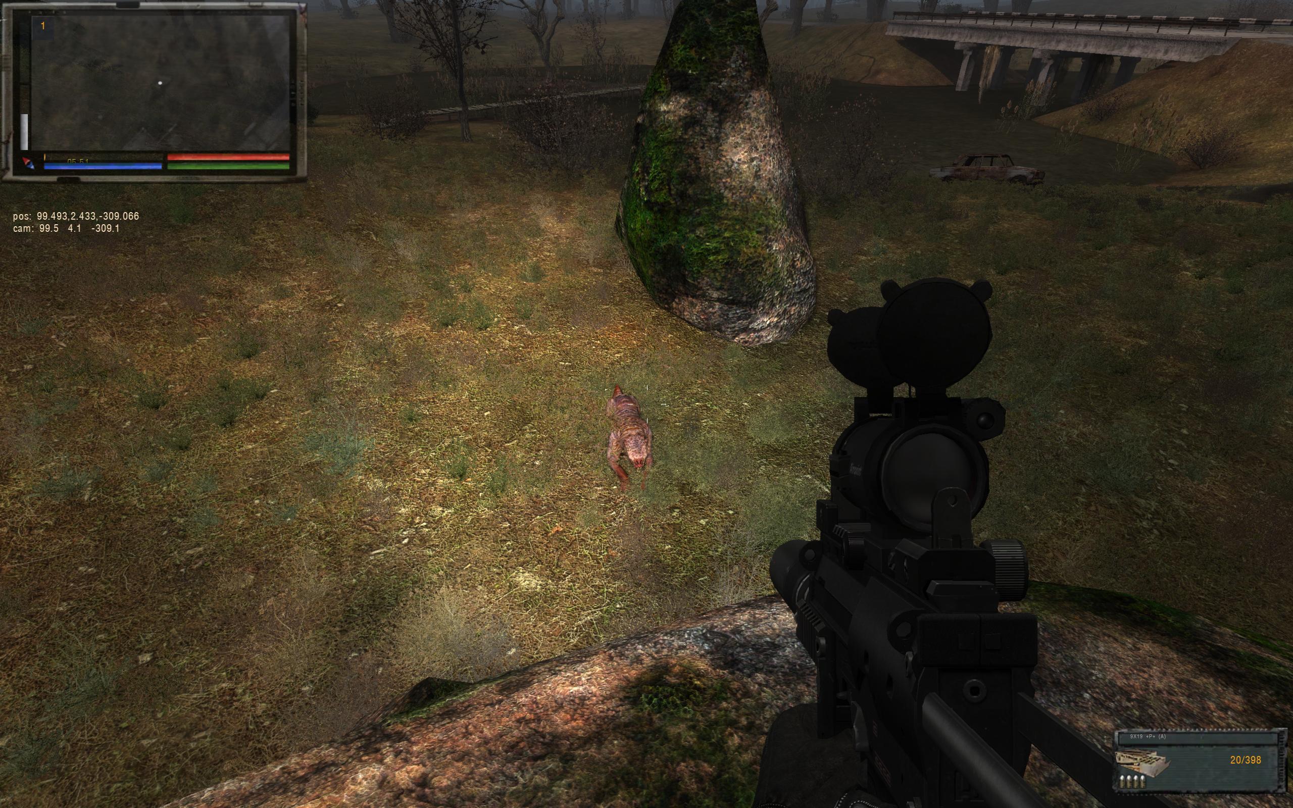 06. А это у меня каким-то образом на Кордоне с блок-поста приехал в центр локации один из двух БТРов. Так там и торчит. Сталкеров под мостом типа не замечает, и они его тоже -- но это пока я не подойду. Ну, пусть стоит -- четыре гранаты к гранатомёту у меня уже есть, и сам грантатомёт у бандита отобрал :-)