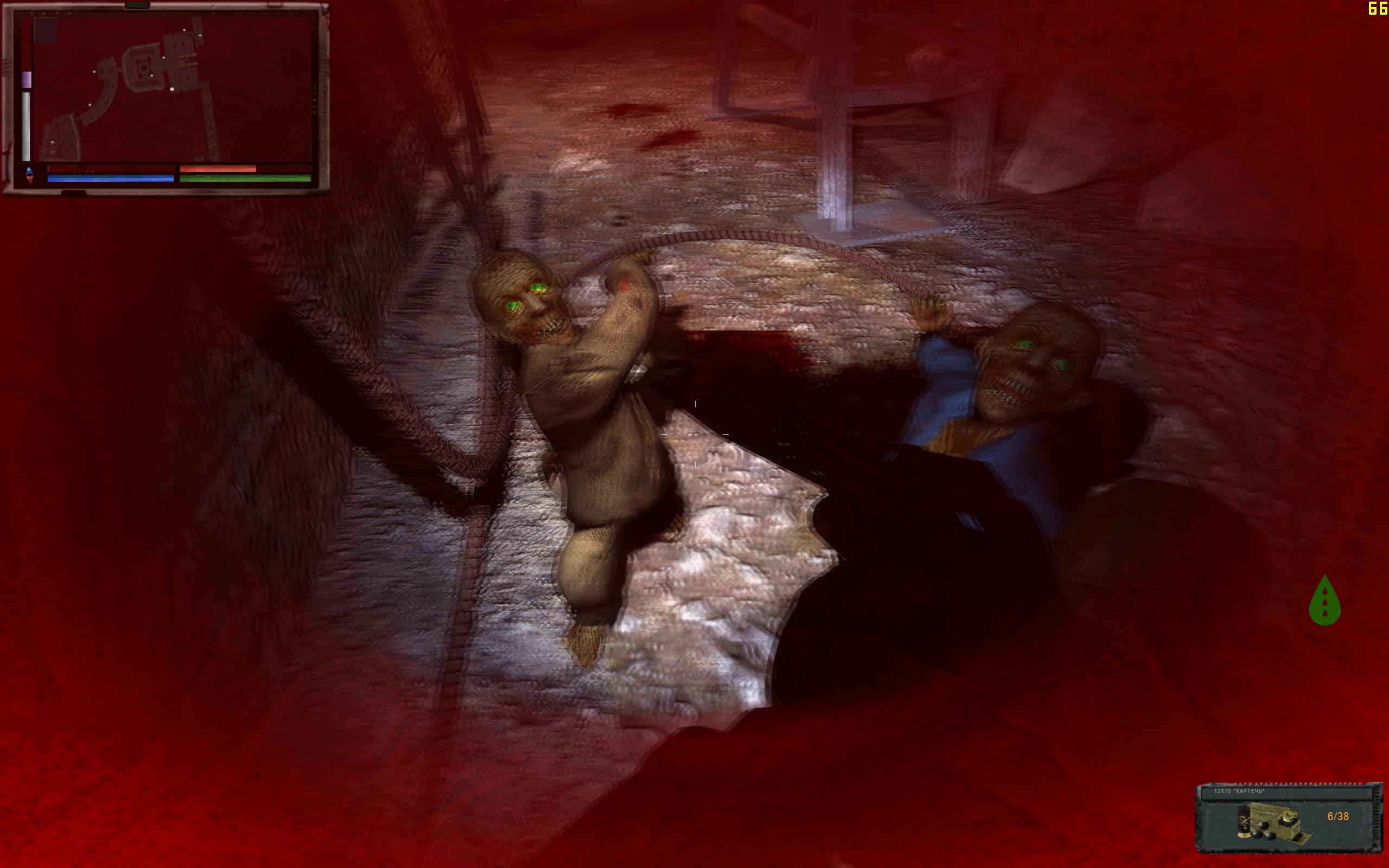 09. Небольшой недостаток движка: трупы могут располагаться в разных позах. Это вот в Пещере -- бюреров я уже перебил, но так бежишь по коридору, а он стоит, хоть и дохлый.