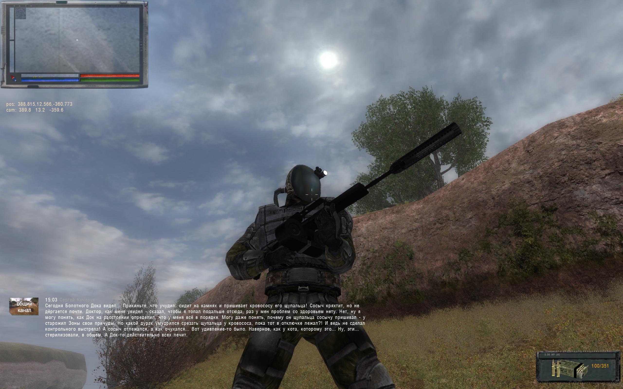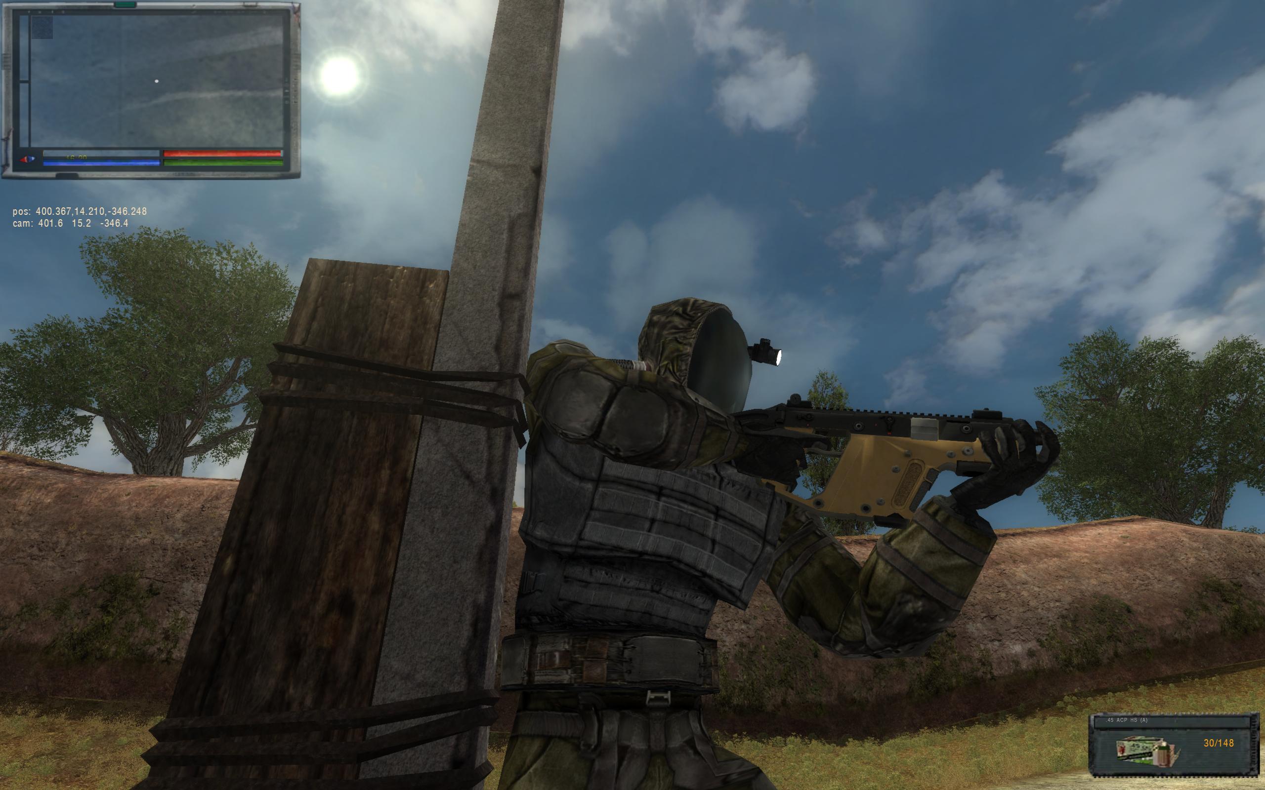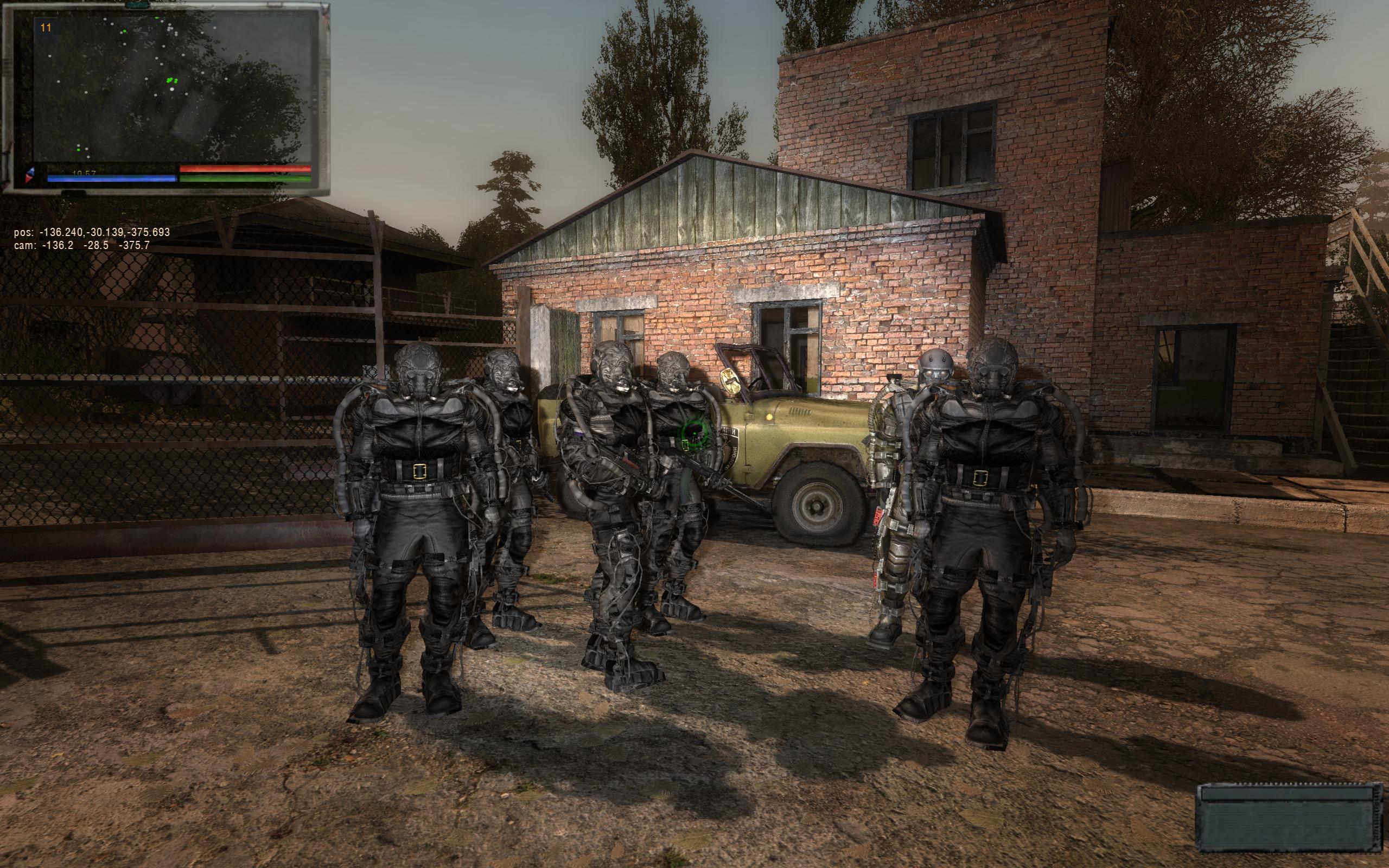 05. Блокпост военных на Кордоне, кстати, выносится вообще без проблем по сравнению с ЧН Hardware mod. Я-то готовился, готовился... Даже капсулы аномалий использовал и мины разложил там, где будут враги на меня кидаться, как самый нужный чемодан возьму. А там приходит на помощь такая вот бригада, причём, похоже, бессмертная поголовно. Можно отсидеться в кустах.