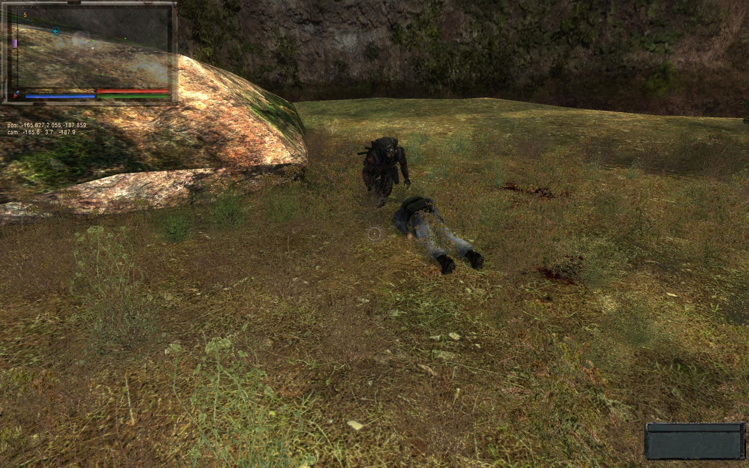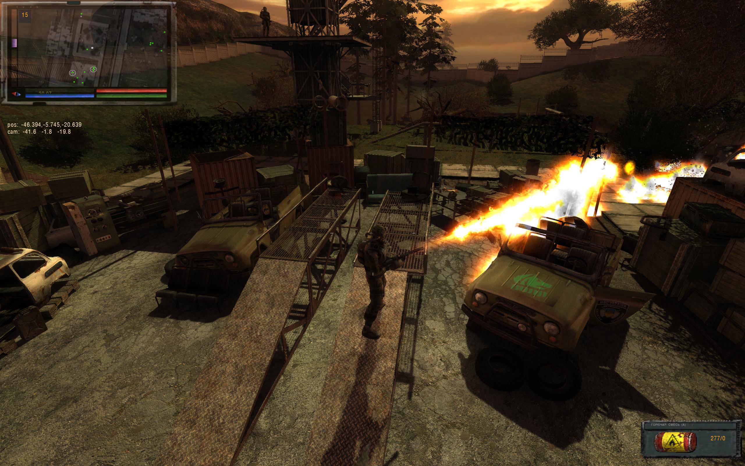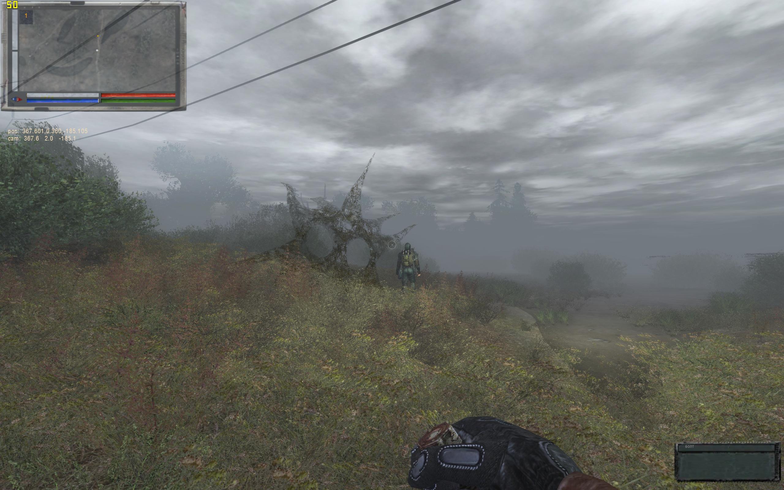 05. Блокпост военных на Кордоне, кстати, выносится вообще без проблем по сравнению с ЧН Hardware mod. Я-то готовился, готовился... Даже капсулы аномалий использовал и мины разложил там, где будут враги на меня кидаться, как самый нужный чемодан возьму. А там приходит на помощь такая вот бригада, причём, похоже, бессмертная поголовно. Можно отсидеться в кустах.