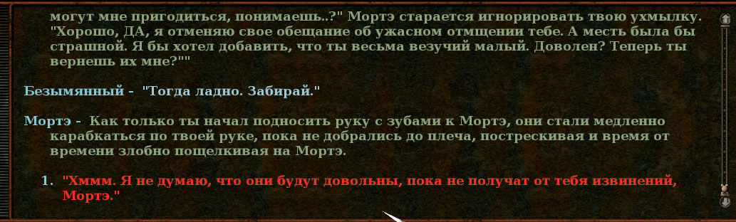 На тему восстановленных диалогов и т.п.: ни на что не наталкивался, но вот этого ИМХО не было. Тут отрывок, а вообще очень забавно -- сначала Морте отфыркивается от зубов, затем их обижает, они сбегают, он извиняется...